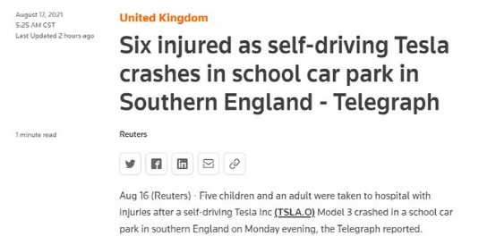 据网易科技,当地时间周一晚间(美股盘后),一辆处于自动驾驶状态的特斯拉Model 3电动汽车在英格兰南部一所大学停车场发生车祸,5名儿童和1名成年人受伤被送往医院。