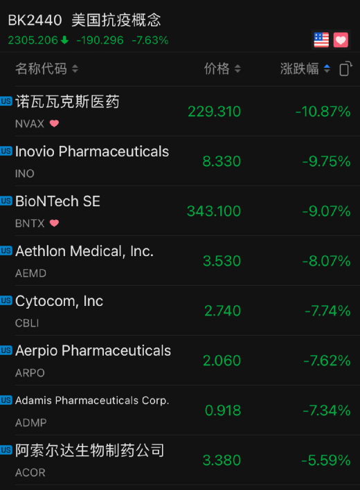 其中,诺瓦瓦克斯大跌近11%,市值蒸发20亿美元,约合130亿人民币。Biontech大跌9%,市值蒸发83亿美元,约合537亿人民币。