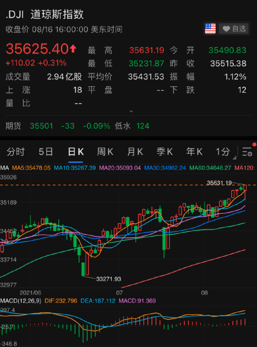 截至收盘,道琼斯指数涨0.31%,报35,625.40点,创新高,标普500指数涨0.26%,报4,479.66点,创新高;而纳斯达克指数跌0.20%,报14,793.80点。