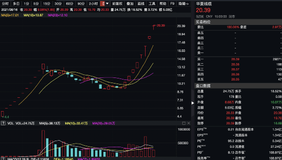 华菱线缆自2021年6月24日正式在深交所挂牌上市以来,该股已经累计上涨363%,当前市值为108.97亿元,股价20.39元。