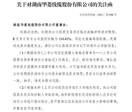 8月16日晚间,深交所向华菱线缆下发关注函,注意到近期公司股票交易多次触及涨幅异常波动情形,8月5日至今公司股价涨幅为114.41%,同比大盘偏离值较高。