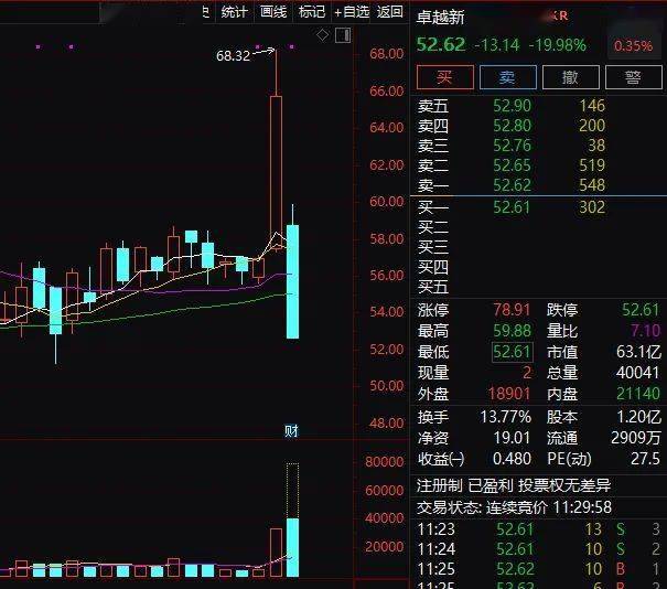 20CM的剧烈波动,昨日卓越新能上冲20%涨停后,今天开盘后快速20%跌停。昨天高位买入的投资者一下跌去30%多。