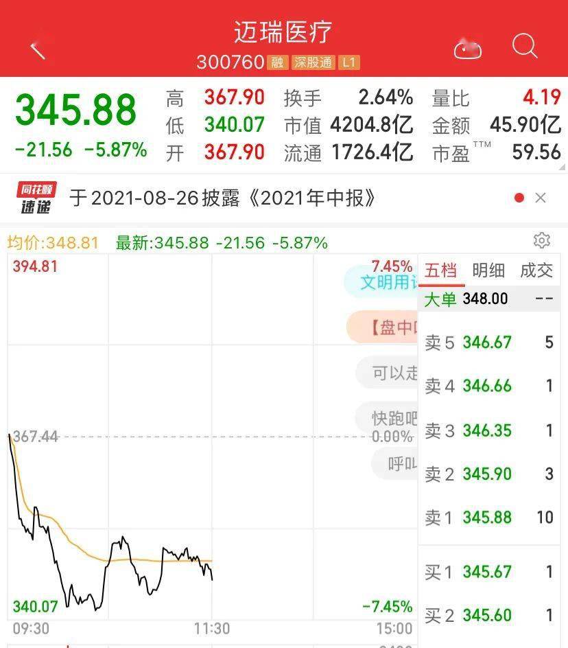 4000多亿市值的医疗巨头迈瑞医疗,今早开盘后突然闪崩,盘中一度跌超6%。