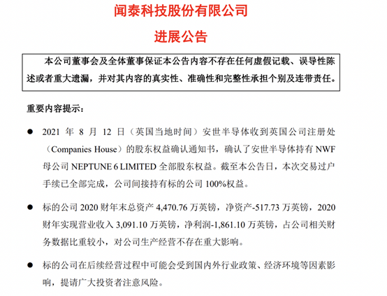 8月16日,闻泰科技发布公告称,英国当地时间8月12日,公司全资子公司安世半导体收到英国公司注册处 (Companies House)的股东权益确认通知书,确认了安世半导体持有 NWF 母公司 NEPTUNE 6 LIMITED 全部股东权益。截至本公告日,本次交易过户手续已全部完成,公司间接持有NWF 100%权益。