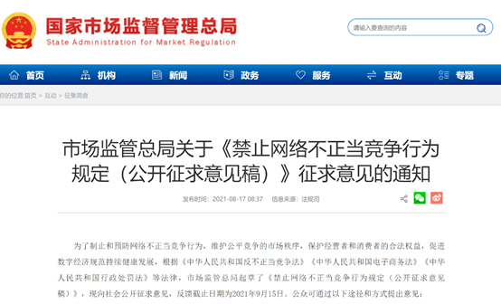 8月17日,国家市场监管总局发布《禁止网络不正当竞争行为规定(公开征求意见稿)》(下称《意见稿》),并公开征求意见。