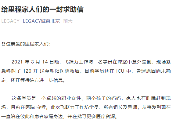 根据LEGACY官方公告,14 日晚,飞跃力工作坊一名学员在课室中意外晕倒。现场紧急呼叫了 120 并 送至朝阳医院救治。目前学员还在 ICU 中,昏迷原因尚未确定,还在等待院方进一步信息。