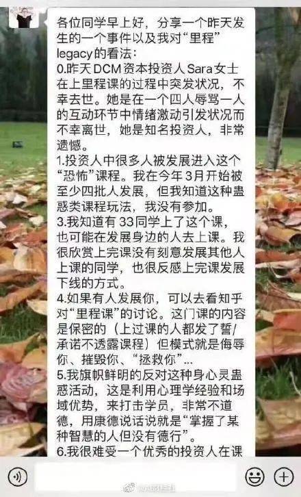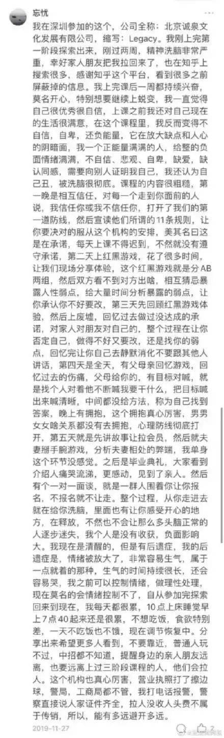 据每日经济新闻报道称,一名曾在深圳参加过类似“心灵课程”的投资人告诉记者,与上面截图中所说的情况类似,这类课程在比较极端的情况下会采取一种侮辱学员、严重打压其自尊的方式来进行,理念就是“要彻底摧毁才能重建”。但并不是所有人都能接受和承受这样的方式,因此之前也有人把这类课程称为“精神控制”。