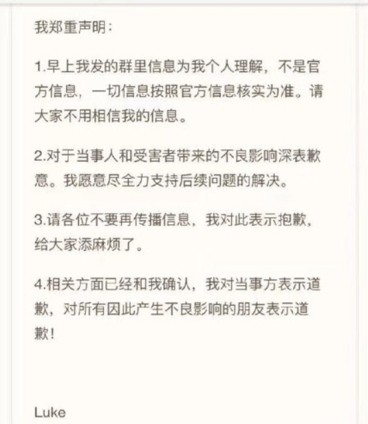 不过随后很快,luke发布声明称,早上发的群里信息为个人理解,不是官方信息,一切信息按照官方信息核实为准。“相关方面已经和我确认,我对当事方表示道歉,对所有因此产生不良影响的朋友表示道歉!”