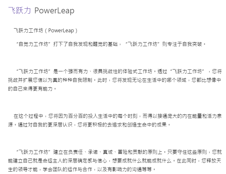 LEGACY共开设有八个不同类型的工作坊,魏萌参加的飞跃力工作坊是一个强有力、具有挑战性的体验式工作坊,专注于自我突破。在这个工作坊,学员将挑战并扩展信以为真的种种自我限制,参加课程后将发现无论在生活中的哪个领域,自己都比想象中来得更有能力。
