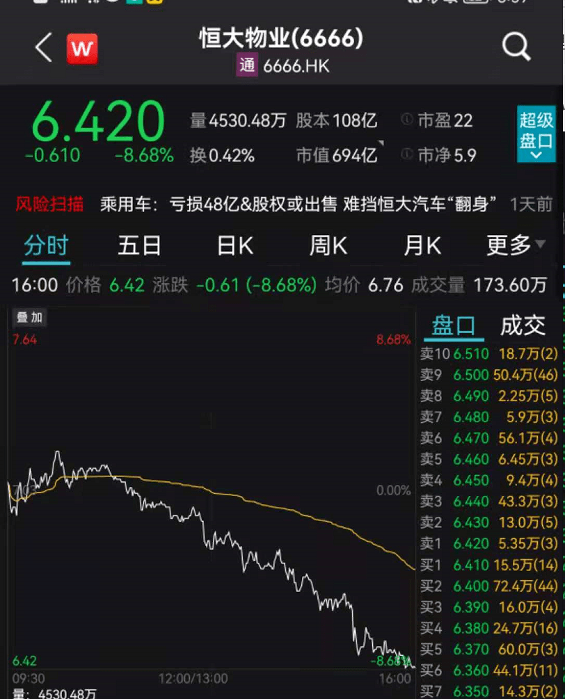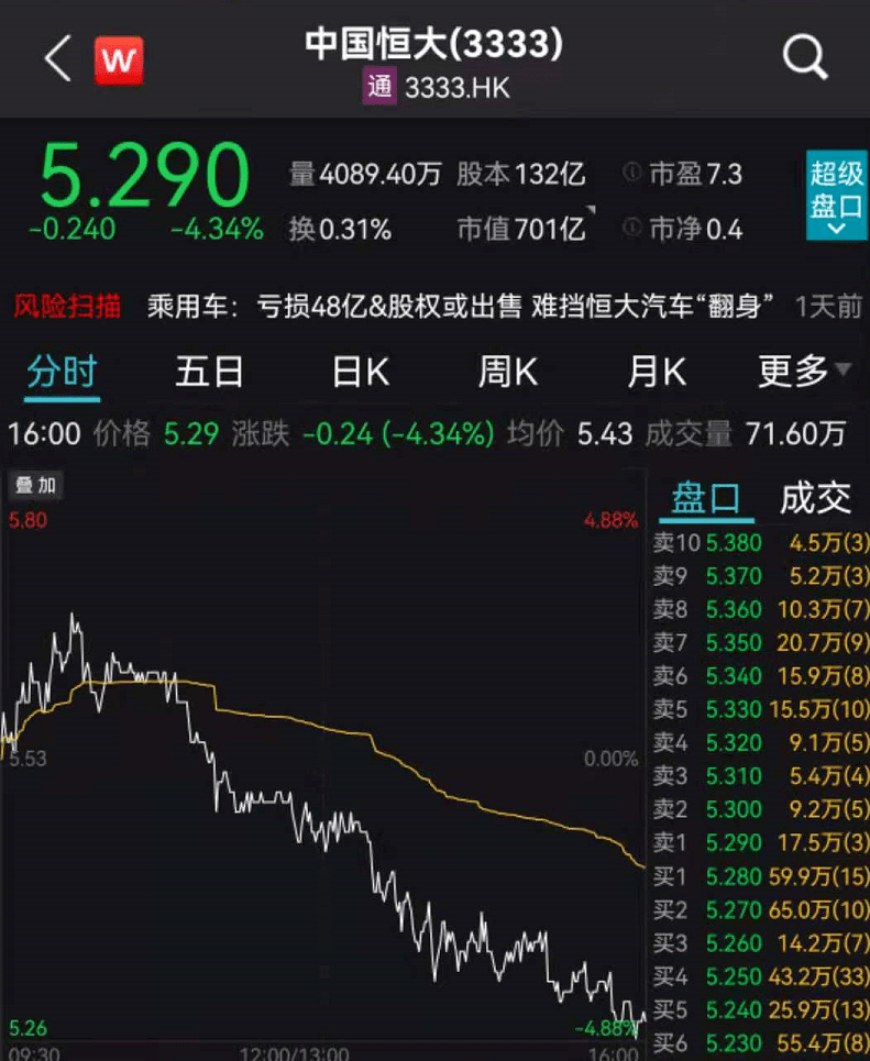 受上述消息的影响,恒大股债都大跌。截至收盘,中国恒跌逾4%:
