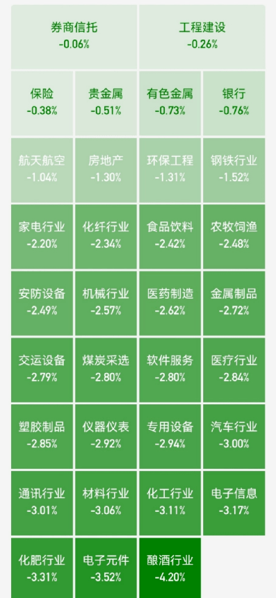 行业板块呈现普跌态势,两市下跌股票数量达到3800只,其中酿酒与半导体板块领跌,消费、医药、科技制造等主线板块纷纷深度回调,航空运输、基建表现稍强。