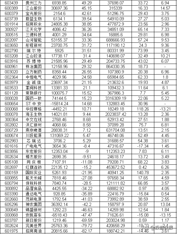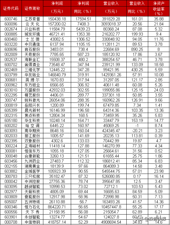 根据今日最新公布的85家A股上市公司,净利润同比增加超过100%的共有29股,分别是江苏索普、云天化、兴业科技、城发环境、士兰微、中贝通信、岩石股份、天奇股份、海联金汇、舍得酒业、三维化学、华友钴业、英博尔、东方坦业、万盛股份、精艺股份、锐科激光、岳阳兴长、晨光新材、焦点科技、华生科技、哈空调、南华期货、丽江股份、双象股份、正海磁材、恒信东方、合康新能、九州药业。