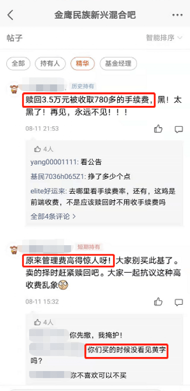 从各平台的相关评论中可以发现,不少投资者在买入金鹰民族新兴时,并未留意到与普通基金有何不同,往往在赎回时,才发现费用比其他基金要高,于是引发一些不明就里的投资者质疑。