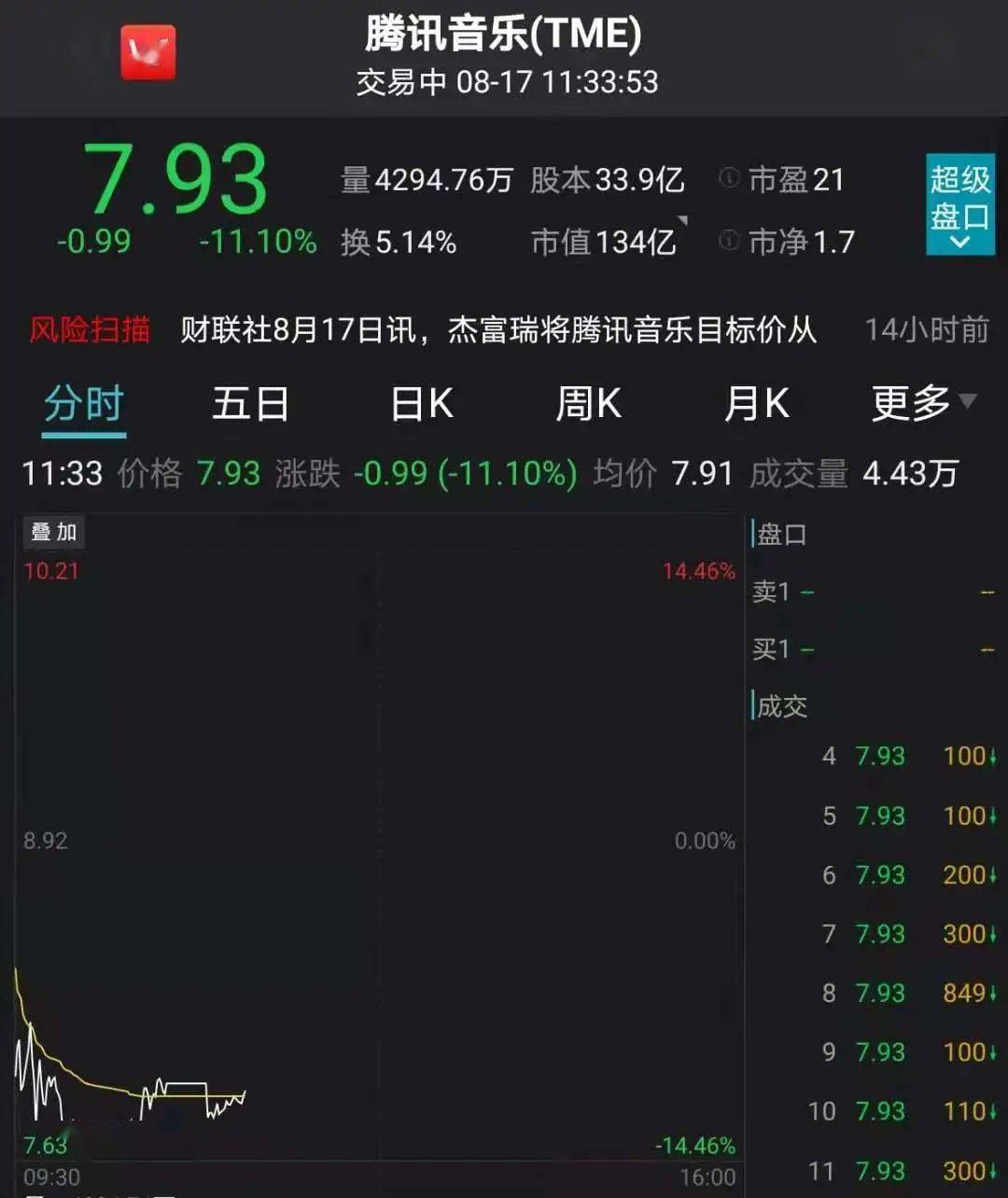 截至发稿,腾讯音乐下跌11.1%,报7.93美元。据年内高点已经下跌超70%。最新市值134亿美元,约合870亿元人民币。