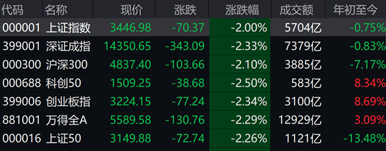 8月17日,沪深两市遭遇一波较大幅度的调整。截至当日收盘,各大指数全线重挫,上证指数下跌2%报3446.98点,深证成指跌2.33%,创业板指跌2.34%,两市3800家公司下跌,成交额超1.3万亿元,连续20个交易日突破万亿。北向资金全天净买入14.74亿元。