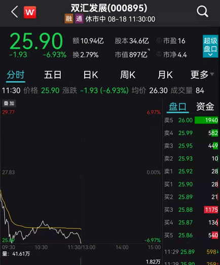 双汇发展开盘便一路下挫,截至收盘,收跌近7%,市值再度蒸发60亿元至897亿元。