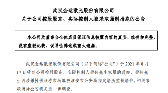 昨日晚间,金运激光发布公告称,公司于2021年8月17日收到公司控股股东、实际控制人梁伟家属的通知,梁伟因涉嫌操纵证券市场罪被淮安市公安局指定居所监视居住。相关事项尚待公安机关进一步调查。