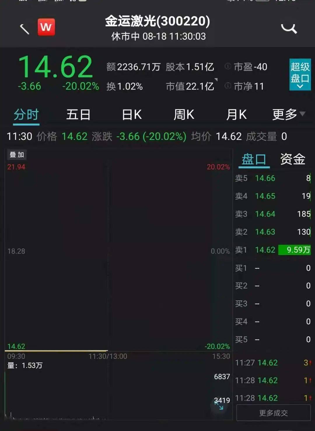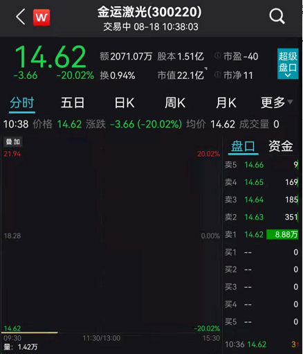 8月18日, 金运激光 早盘一字跌停。截至发稿,股价报14.62元,跌停封单近10万手。