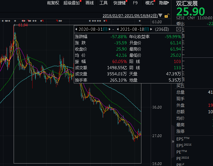 值得注意的是,双汇发展自2020年8月底至今,股价早已腰斩,跌幅近60%。