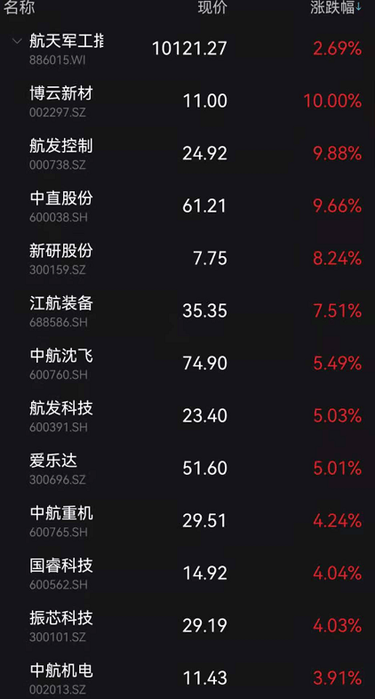 军工板块也再度走强。航天军工指数收涨2.69%。