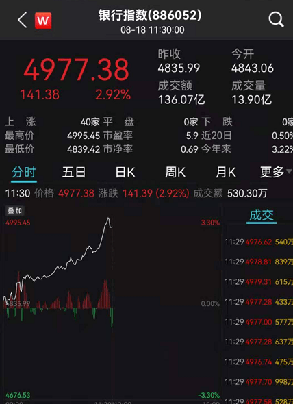 银行股集体走强,指数大涨近3%。成分股中全线上涨。