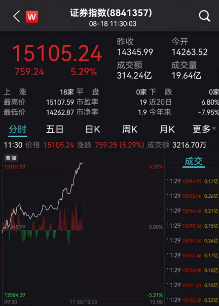 券商指数今天一路走高,截至收盘,涨幅近5%。
