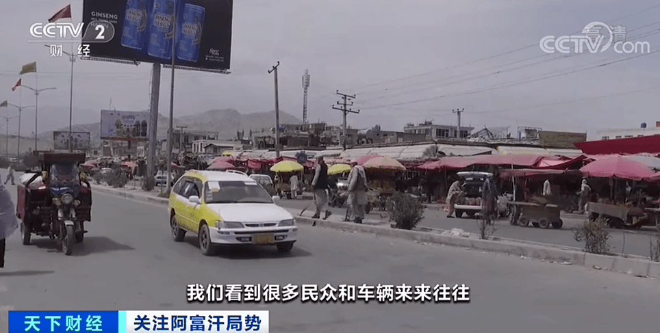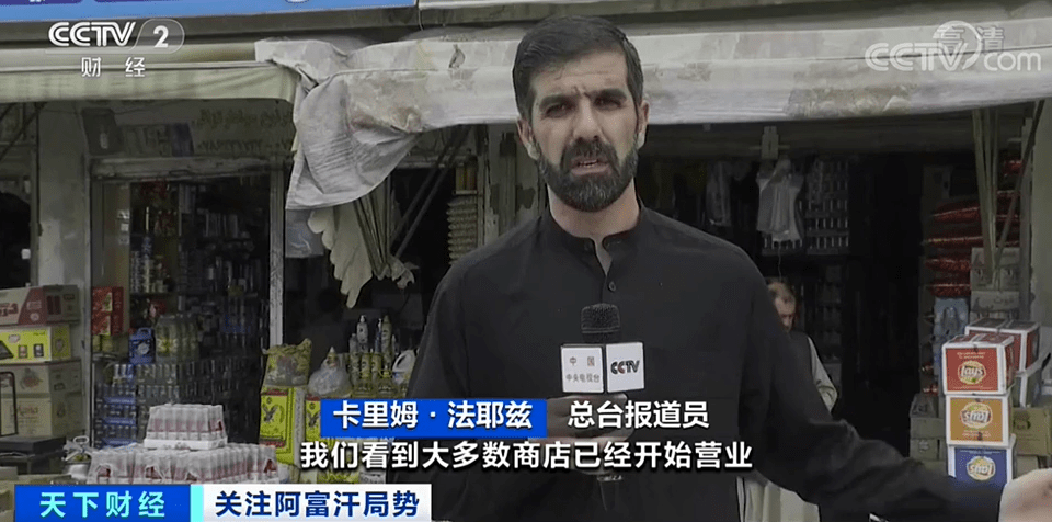 总台报道员 卡里姆·法耶兹:这是喀布尔市的一个市场,大多数商店已经开始营业,看起来局势正在逐步恢复正常,我们看到很多的民众和车辆来来往往,询问了一些民众,他们还算安全,但对物价的上涨非常担心。