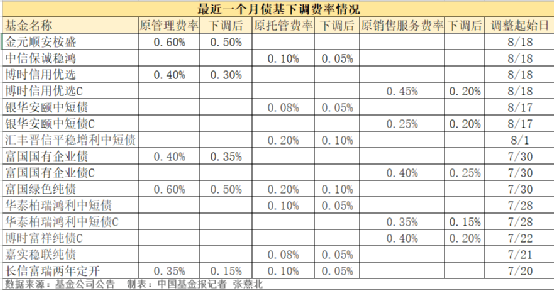 据记者不完全统计,按照新费率实施起始日统计,截至8月18日,最近一个月多达11只债基(各份额合并计算)下调费率,涉及费率类别包括管理费、托管费、销售服务费等。