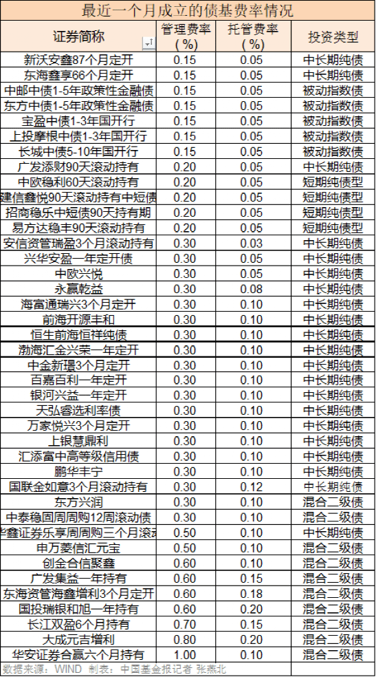 “目前新发的纯债基金管理费可压降到0.2%,托管费压降到0.05%,如果是债券指数基金,相关管理费最低可达到0.15%。这也是目前基金公司在扣除各项管理成本后的价格底线,新发债券基金基本已经按照这一费率标准执行。” 上述固收部人士表示。
