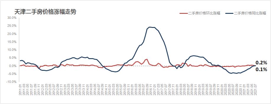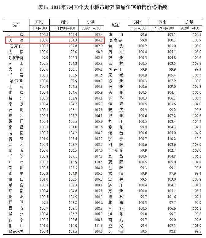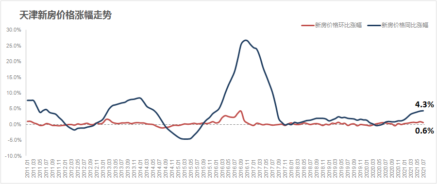 国家统计局数据显示,2021年7月,天津新房价格环比上涨0.6%,同比上涨4.3%;二手房价格环比上涨0.2%,同比上涨0.1%。
