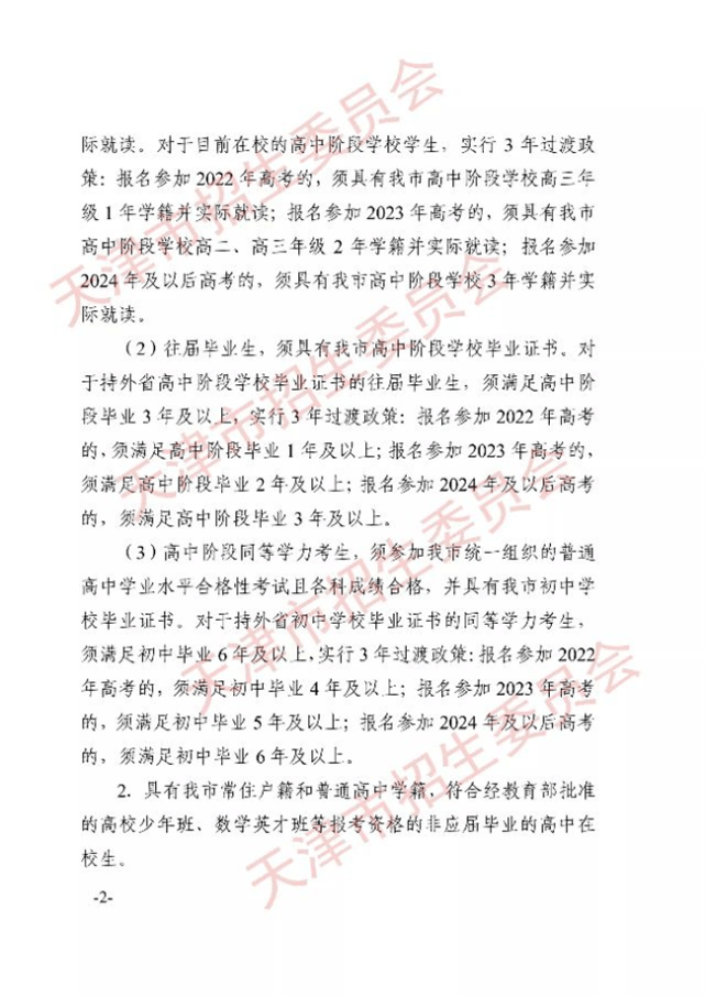 而对于目前在校的高中阶段在校学生,《通知》表示实行3年过渡政策:报名参加2022年高考的,须具有天津市高中阶段学校高三年级1年学籍并实际就读;报名参加2023年高考的,须具有天津市高中阶段学校高二、高三年级2年学籍并实际就读;报名参加2024年及以后高考的,须具有天津市高中阶段学校3年学籍并实际就读。
