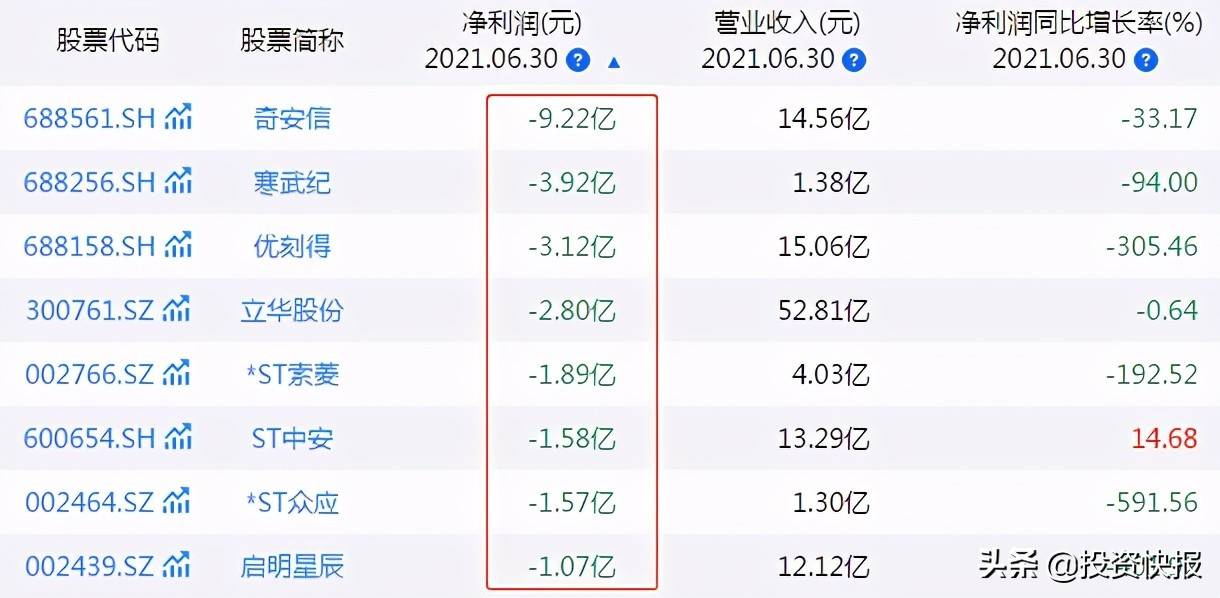 从业绩亏损金额上来看,奇安信、寒武纪、优刻得、立华股份、*ST索菱、ST中安、*ST众应、启明星辰等8家公司亏损金额在1亿元或以上。其中奇安信暂列两市亏损王的位置,2021年上半年,奇安信实现营收14.56亿元,同比增长44.54%,净利润-9.22亿元,公司上年同期亏损6.92亿元,亏损同比扩大33.17%。