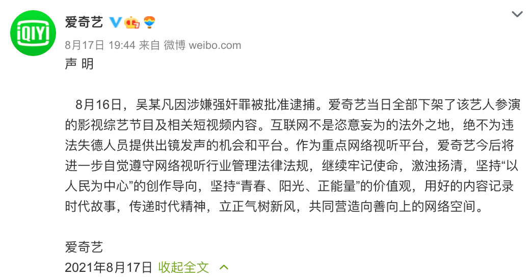 我们注意到8月16日,吴某凡的作品已从多个网络视听平台下线,协会今天上午也就此事发声,请介绍一下协会对此事的看法。