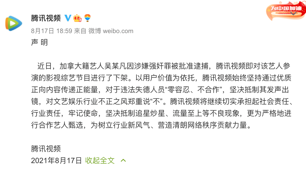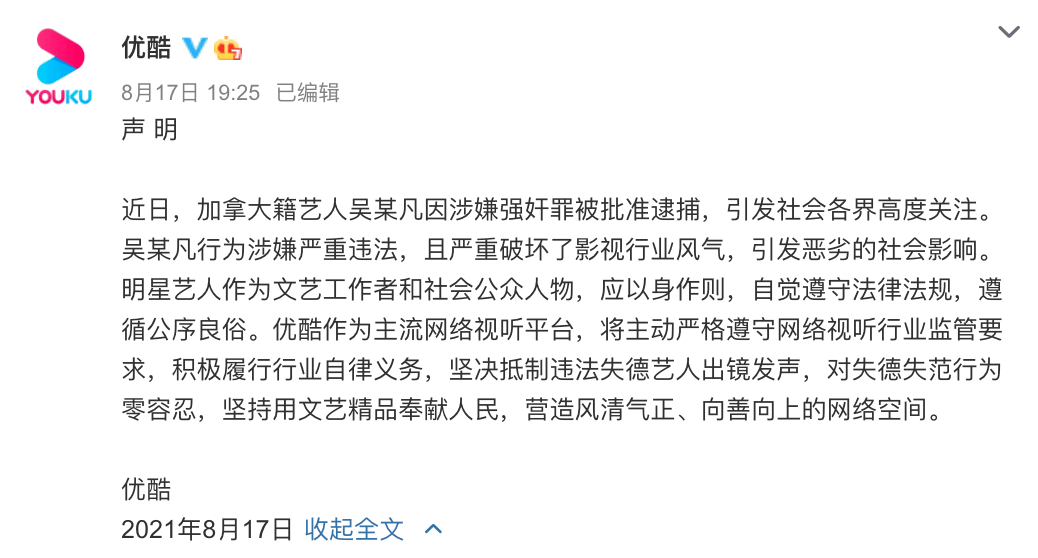8月17日晚,多家视频平台发声明表示,已下架吴亦凡的影视综艺节目。