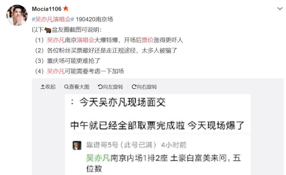 据吴亦凡粉丝@Mocia1106回忆:“南京场当时开票秒空,开场后各种档次的票价飙升3—5倍,黄牛遍地走,很多人被骗。”