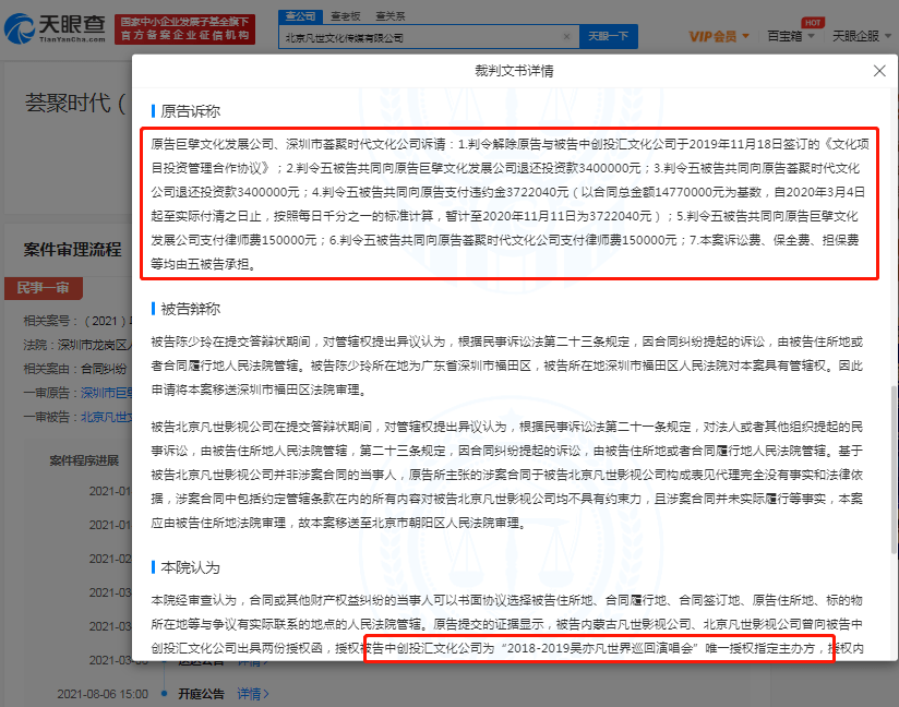 据了解,上述合同纠纷主要是去年因为疫情而取消的演唱会的相关合同纠纷。