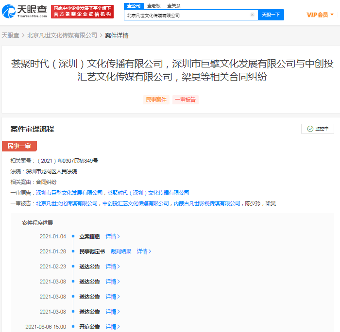 据天眼查显示,近日,吴亦凡关联公司北京凡世文化传媒有限公司、内蒙古凡世影视传媒有限公司等因合同纠纷被起诉,开庭时间为8月6日。
