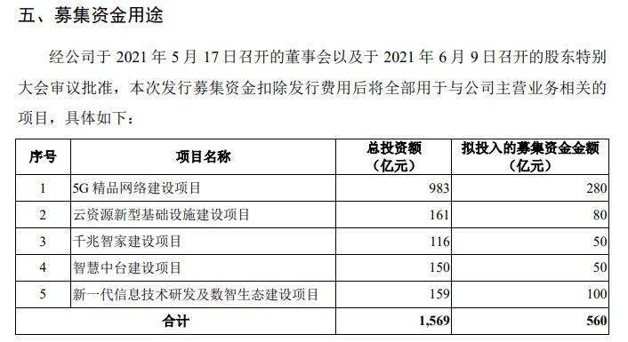 本次募投项目中,拟投入的募集资金金额为560亿元,用于5G精品网络建设、云资源新型基础设施建设、千兆智家建设、智慧中台建设以及新一代信息技术研发及数智生态建设项目,而这些项目的总投资金额将达到1569亿元。