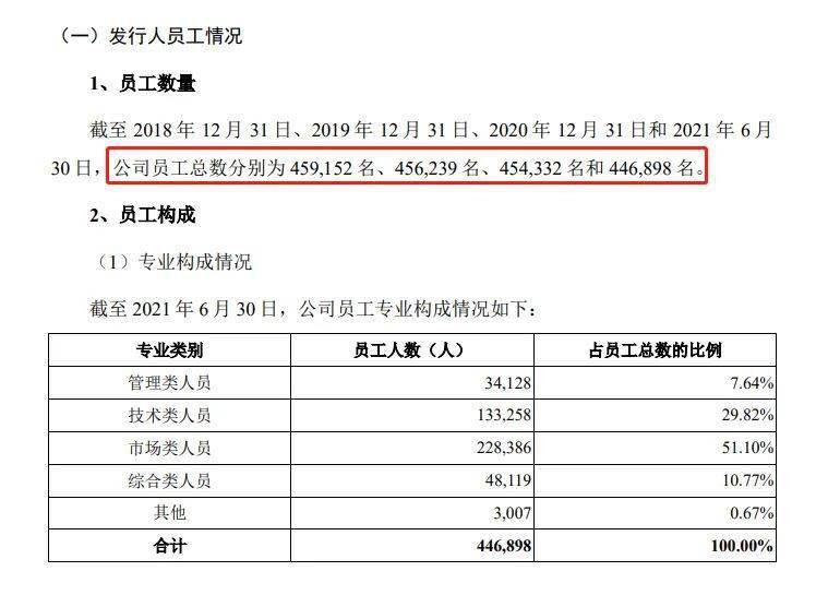 中国移动这几年人员有所精简,从2018年底的45.92万人,降至最新的2021年6月底的44.69万人。不过,仍远高于即将上市的中国电信披露的28万人。