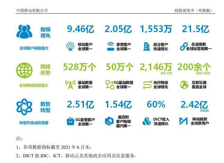 8月18日晚间,中国证监会官网披露中国移动招股书,拟发行人民币股份数量不超过9.65亿股,即不超过人民币股份发行后公司已发行普通股总数的4.50%(行使超额配售选择权之前);拟于上交所上市,募投项目拟投入募集资金金额为560亿元。