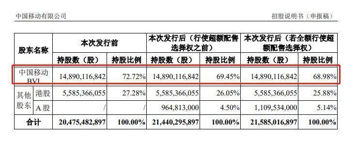 从股本情况来看,本次A股IPO发行之前,控股股东中国移动集团通过中国移动BVI持股72.72%,发行后(超额配售权行使前)持股比例降至69.45%;发行后(全额行使超额配售权)持股比例降至68.98%。