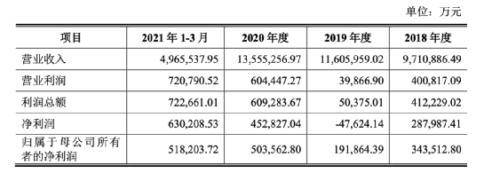 从近年来的财务指标来看,2018-2020年以及2021年1-3月,公司分别实现销售收入971.09亿元、1160.6亿元、1355.53亿元及 496.55亿元,公司收入整体呈上升趋势。