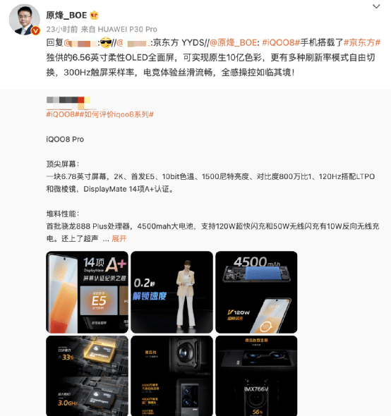 随后,公司副总裁在微博回应称,iQOO8手机搭载了京东方独供的6.56英寸柔性OLED全面屏。