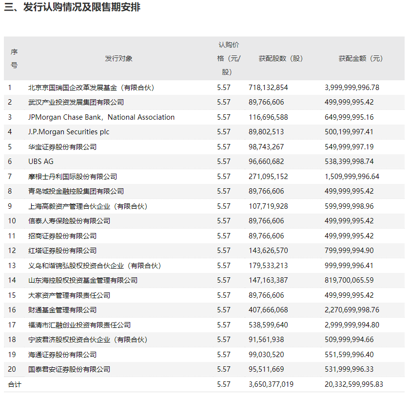 从参与的机构分类来看,20家获配对象中有4家外资机构,其中摩根士丹利获配15亿元、瑞银集团(UBS AG)获配5.38亿元、摩根大通合计获配11.5亿元(JPMorgan Chase Bank, National Association、J.P.Morgan Securities plc)。
