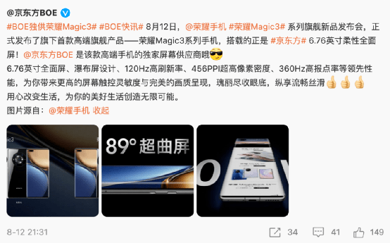 近期,京东方的大动作不断。8月12日晚间,在荣耀Magic3系列旗舰新品发布会上,荣耀终端有限公司CEO赵明正式发布了全新旗舰手机荣耀Magic3系列。新品发布后,京东方表示,荣耀Magic3系列手机搭载的是京东方6.76英寸柔性OLED全面屏,公司为该款高端手机的独家屏幕供应商。