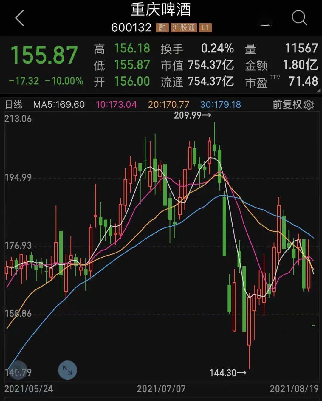 今天早盘,啤酒板块龙头重庆啤酒几乎以跌停价开盘,随后迅速封上跌停板。 截至上午收盘,该股报155.87元,较昨日下跌10%,封单超过1.6万手。