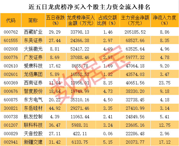 数据显示,一些个股在龙虎榜的机构或营业部中显示出有资金在净买入,并且期间主力资金还在净流入,两方面都说明这些个股受到主力资金青睐。在近五日龙虎榜机构或营业部净买入的119只个股中,主力资金同期净流入的个股有68只,净流入金额最大的个股为 西藏矿业、东吴证券,主力资金分别为20.52亿元、6.85亿元。