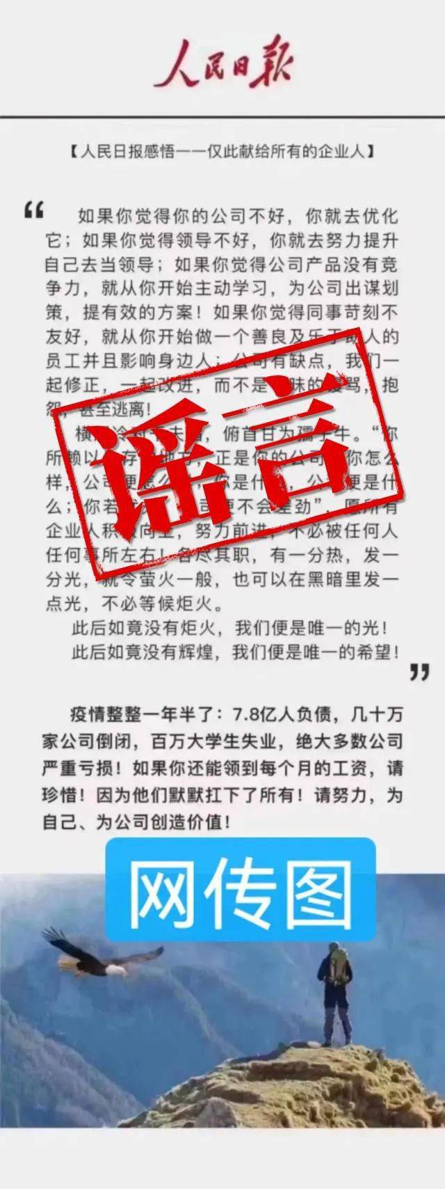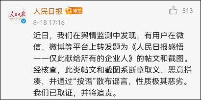 8月18日下午,人民日报在其微博评论区辟谣:近日,我们在舆情监测中发现,有用户在微信、微博等平台上转发题为《人民日报感悟——仅此献给所有的企业人》的帖文和截图。经核查,此类帖文和截图系断章取义、恶意拼凑,并通过“按语”散布谣言,性质极其恶劣。我们已取证,并将追责。