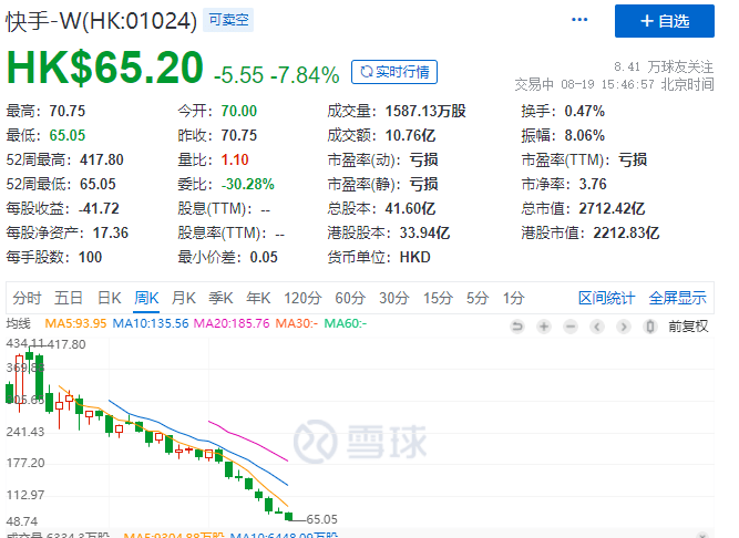 快手跌了8%,已经从上市后的高点,跌去了84%,股价打了1.5折。。。