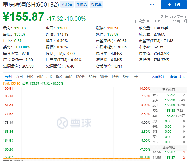 过去五年累计涨幅超过10倍,走高端啤酒路线的重庆啤酒,公布半年报之后却遭遇“见光死”,8月19日一字跌停。
